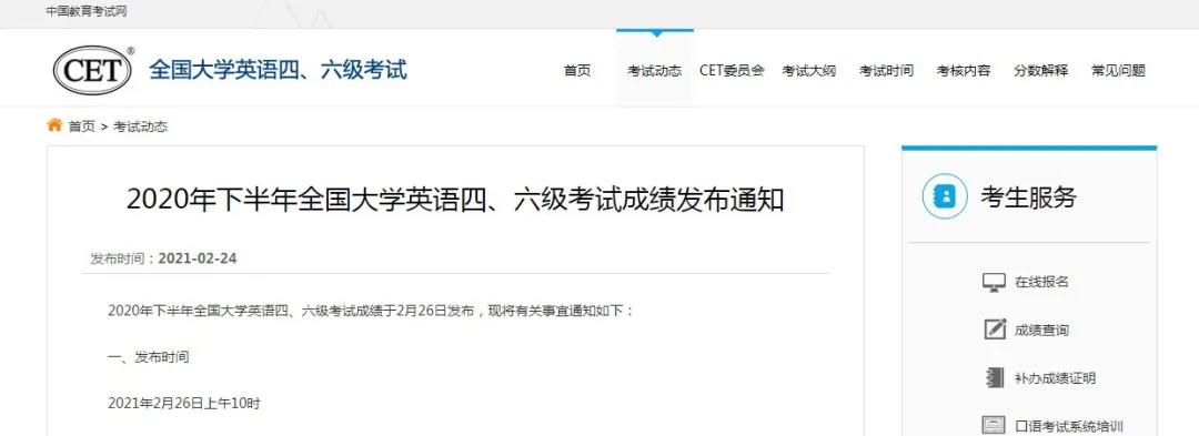 根據教育部考試中心最新消息,2020年12月英語四六級考試成績將于2021年2月26日10:00公布。