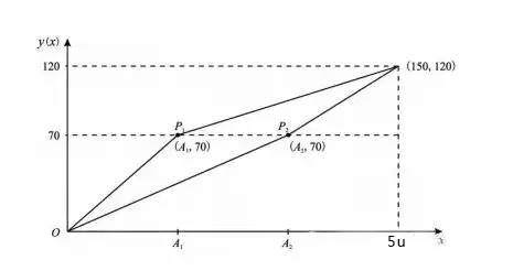 舉例來(lái)說(shuō),設(shè)兩個(gè)科目的合格分?jǐn)?shù)線分別為 A1和 A2,則轉(zhuǎn)換分 y(x) 關(guān)于原始成績(jī)x的函數(shù)圖像,如下圖所示: