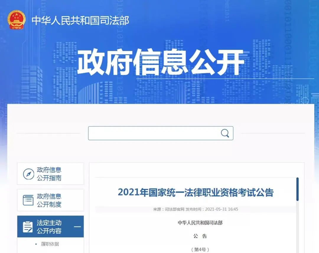 2021年5月31日,中華人民共和國司法部公布了《2021年國家統一法律職業資格考試公告》。
