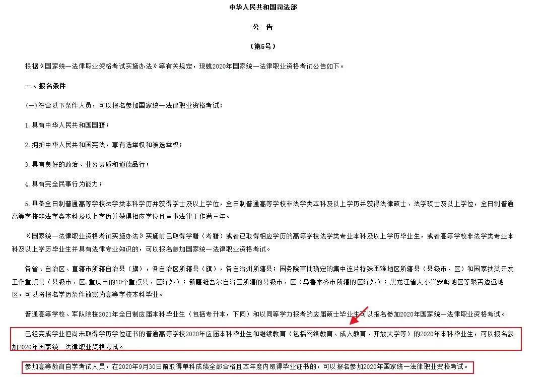 其中提出了在《國家統一法律職業資格考試實施辦法》實施前已取得學籍(考籍),并于2021年國家統一法律職業資格考試報名時已經完成學業但尚未取得學歷學位證書的普通高等學校、軍隊院校2021年應屆本科畢業生和以同等學力報考的應屆碩士研究生及繼續教育(包括網絡教育、成人教育、開放大學等)的2021年本科畢業生,以及參加高等教育自學考試單科成績已全部合格且本年度內能取得畢業證書人員,可以報名參加2021年國家統一法律職業資格考試。
