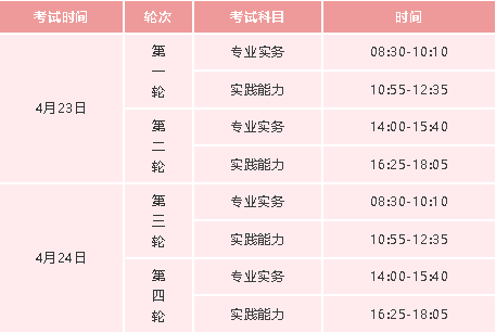 考試分為4輪次進行,每半天為一個輪次,考生將隨機分配至其中一個輪次參加專業(yè)實務(wù)和實踐能力兩個科目的考試,具體考試時間以準考證為準。