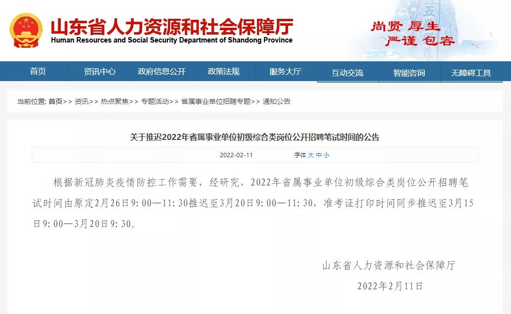 根據(jù)新冠肺炎疫情防控工作需要,經(jīng)研究,2022年省屬事業(yè)單位初級綜合類崗位公開招聘筆試時間由原定2月26日9:00—11:30推遲至3月20日9:00—11:30,準(zhǔn)考證打印時間同步推遲至3月15日9:00—3月20日9:30。