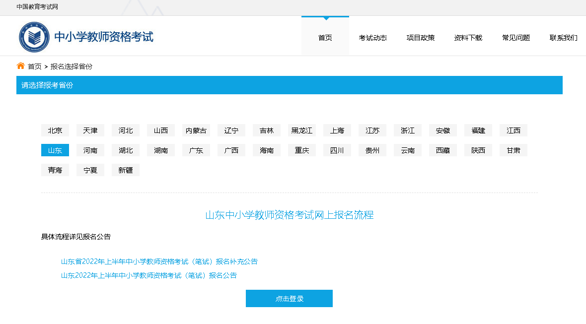 第三步:點擊報名。進入報名系統后,點“點擊登錄”(以“山東”為例)方可進行下一步。