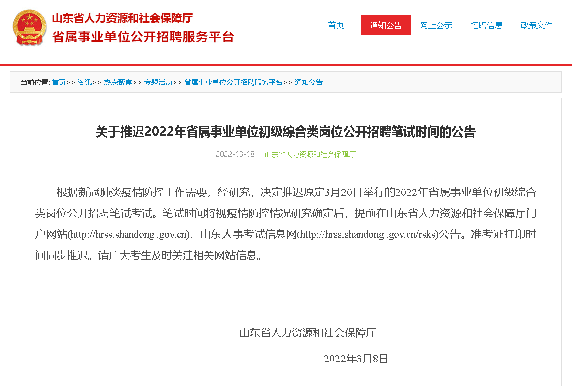 根據新冠肺炎疫情防控工作需要,經研究,決定推遲原定3月20日舉行的2022年省屬事業單位初級綜合類崗位公開招聘筆試考試。筆試時間將視疫情防控情況研究確定后,提前在山東省人力資源和社會保障廳門戶網站(http://hrss.shandong .gov.cn)、山東人事考試信息網(http://hrss.shandong .gov.cn/rsks)公告。準考證打印時間同步推遲。請廣大考生及時關注相關網站信息。