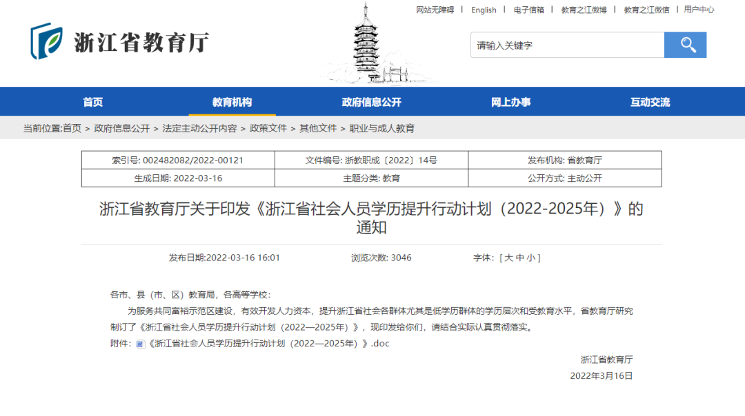 3月16日,浙江省教育廳向社會公布浙江省社會人員學歷提升行動計劃(2022-2025年)。