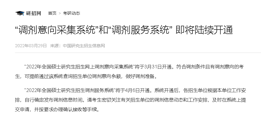 “2022年全國碩士研究生招生網(wǎng)上調(diào)劑意向采集系統(tǒng)”將于3月31日開通。符合調(diào)劑條件且有調(diào)劑意向的考生,可提前通過該系統(tǒng)查詢招生單位調(diào)劑意向余額,做好調(diào)劑準(zhǔn)備。