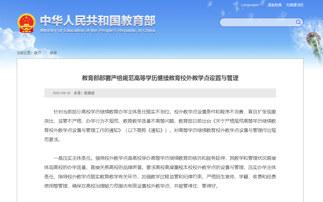 針對當前部分高校學歷繼續教育辦學主體責任落實不到位,校外教學點設置條件和程序不完善、盲目擴張現象突出,監管不嚴格、辦學行為不規范、教育教學質量不高等問題,教育部日前出臺《關于嚴格規范高等學歷繼續教育校外教學點設置與管理工作的通知》(以下簡稱《通知》),對高等學歷繼續教育校外教學點設置與管理作出規范要求。