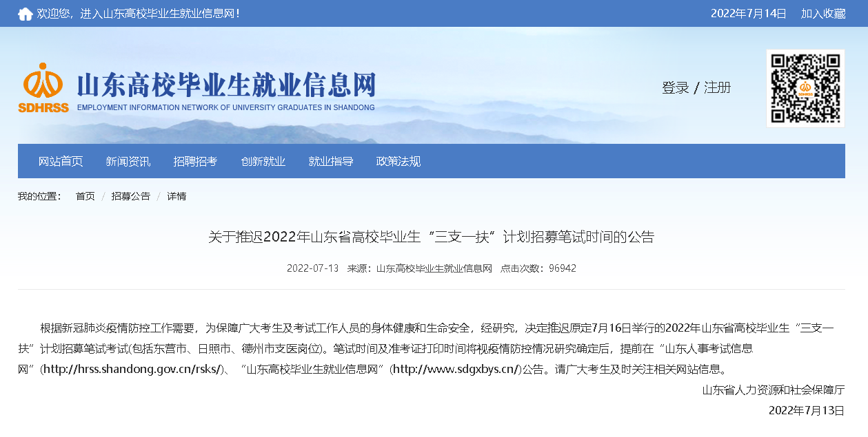 根據新冠肺炎疫情防控工作需要,為保障廣大考生及考試工作人員的身體健康和生命安全,經研究,決定推遲原定7月16日舉行的2022年山東省高校畢業生“三支一扶”計劃招募筆試考試(包括東營市、日照市、德州市支醫崗位)。筆試時間及準考證打印時間將視疫情防控情況研究確定后,提前在“山東人事考試信息網”(http://hrss.shandong.gov.cn/rsks/)、“山東高校畢業生就業信息網”(http://www.sdgxbys.cn/)公告。請廣大考生及時關注相關網站信息。