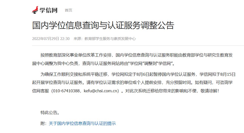 按照教育部深化事業單位改革工作安排,國內學位信息查詢與認證服務網站由“學位網”調整到“學信網”。