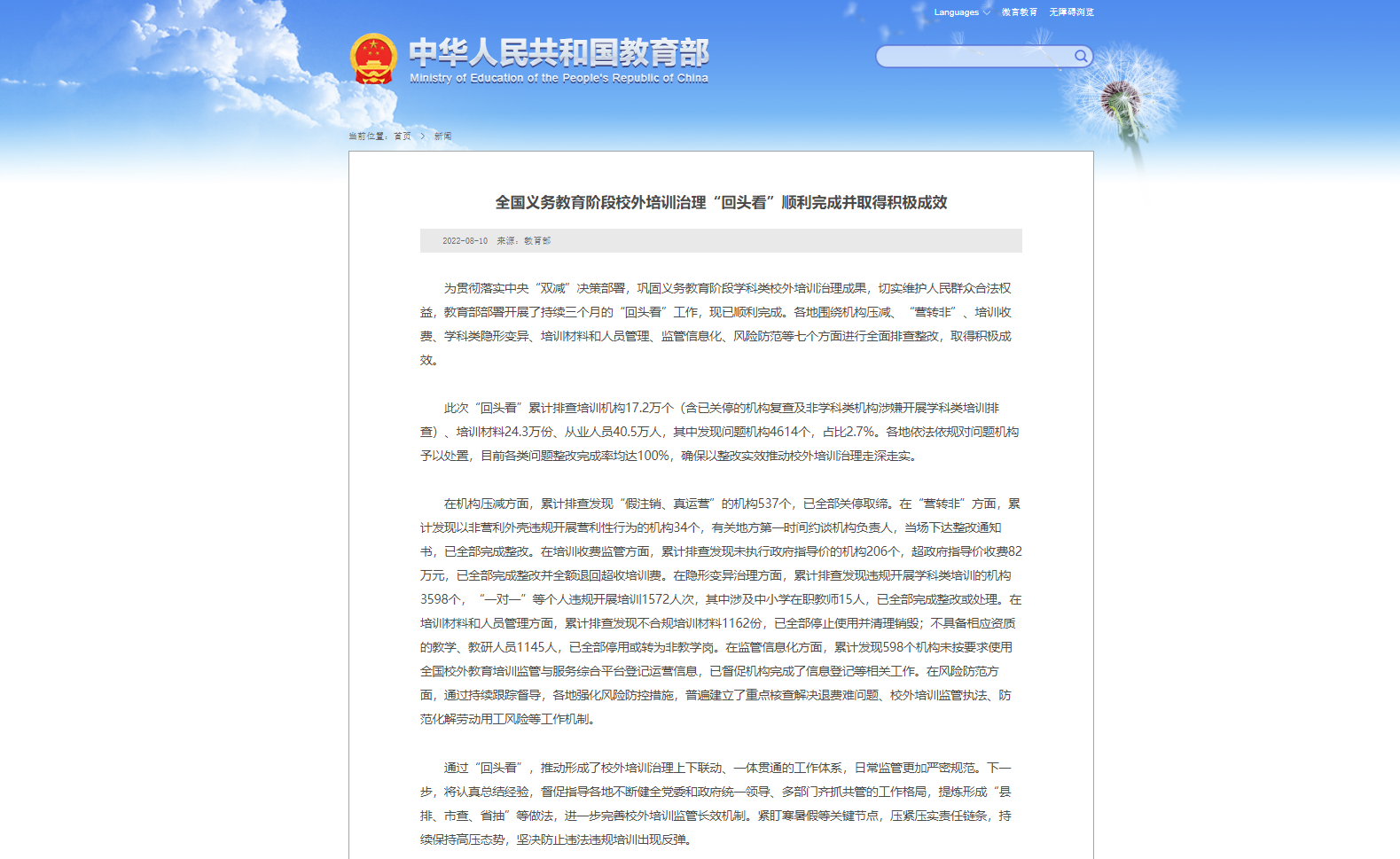 全國義務教育階段校外培訓治理“回頭看”順利完成并取得積極成效