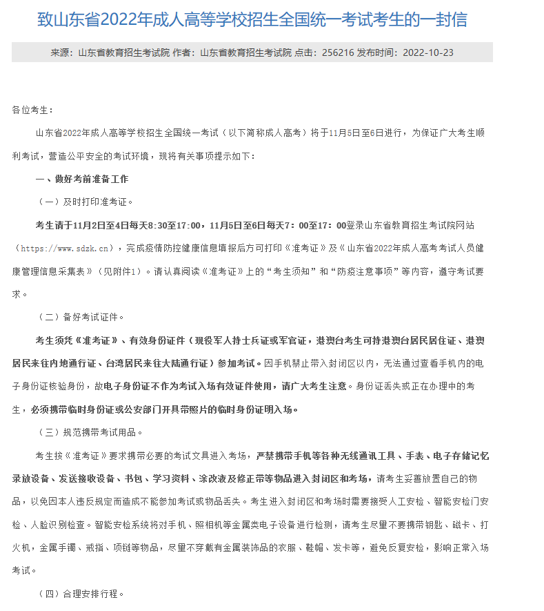 考試時間:山東省2022年成人高等學校招生全國統一考試于11月5日至6日進行