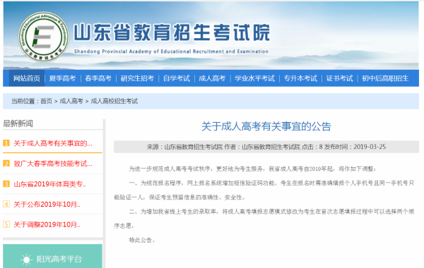 2019年山東成人高考最新政策,個人手機號需驗證同時填報兩個志愿