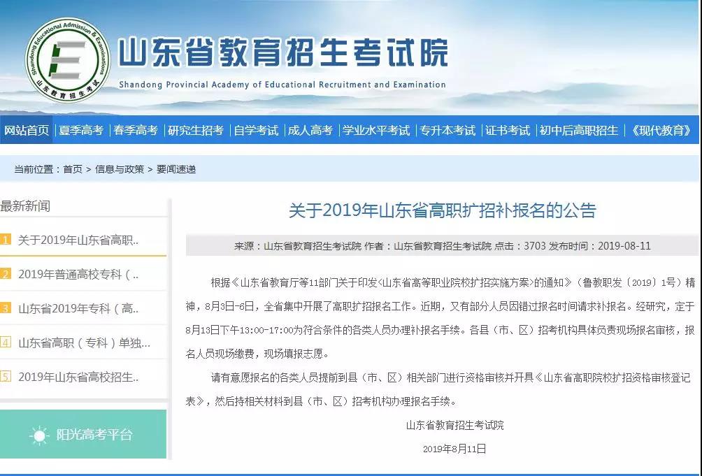 根據《山東省教育廳等11部門關于印發<山東省高等職業院校擴招實施方案>的通知》(魯教職發〔2019〕1號)精神,8月3日-6日,全省集中開展了高職擴招報名工作。近期,又有部分人員因錯過報名時間請求補報名。經研究,定于8月13日下午13:00-17:00為符合條件的各類人員辦理補報名手續。各縣(市、區)招考機構具體負責現場報名審核,報名人員現場繳費,現場填報志愿。