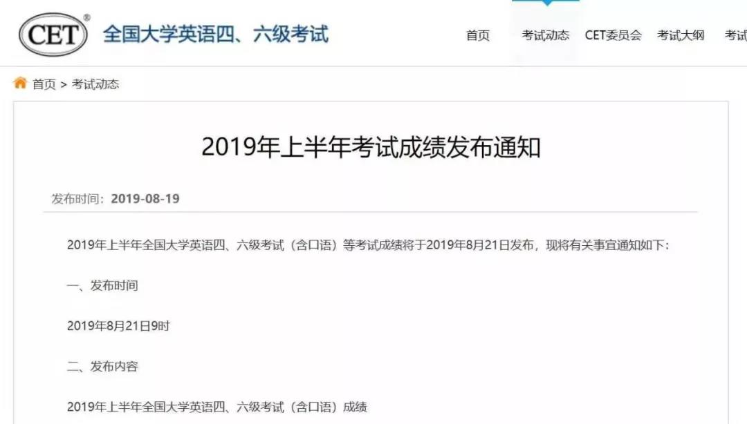 2019年上半年全國大學英語四、六級考試(含口語)成績將于2019年8月21日 (今天)上午9:00發布!