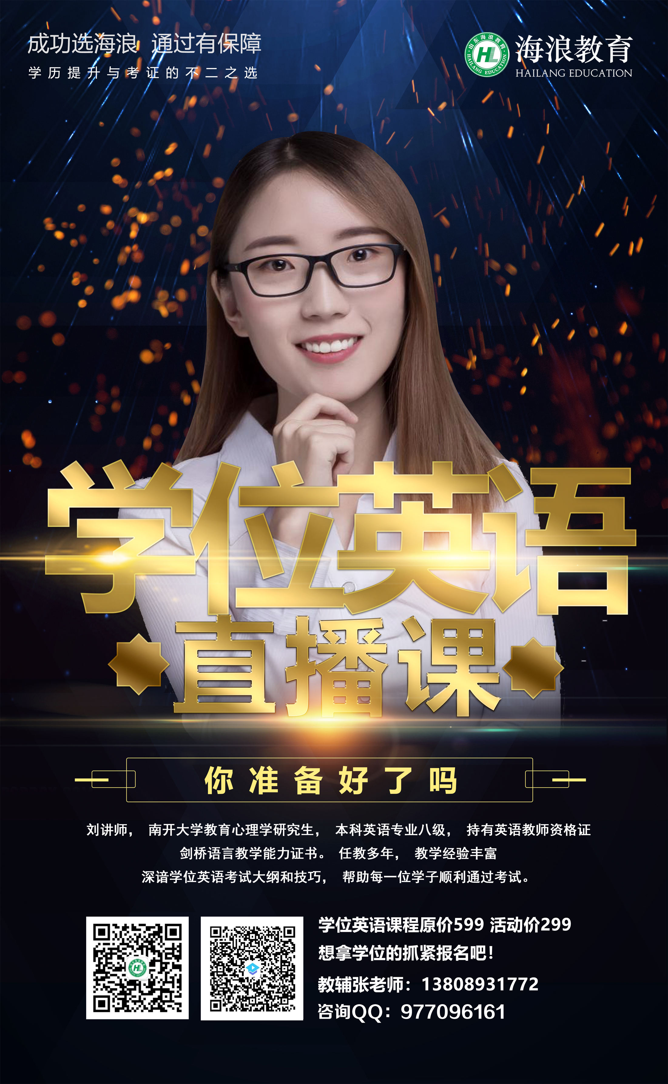 另外,想要報考學(xué)位英語的同學(xué)們注意啦,海浪教育學(xué)位英語沖刺課程火熱報名中,課程內(nèi)容包括名師輔導(dǎo)、習(xí)題講解、在線課程、視頻直播等,具體課程詳情請咨詢教輔老師了解。