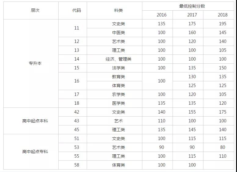 以上是2016年-2018年成考最低控制線,我們可以看出來,2018年部分科類變化明顯,比2017年上漲20分,比如文史類、藝術類。