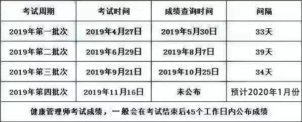 據小編的推斷,2019年第四批健康管理師考試成績查詢就在近期開放,請大家做好查分準備!2019年四次健康管理師時間如下: