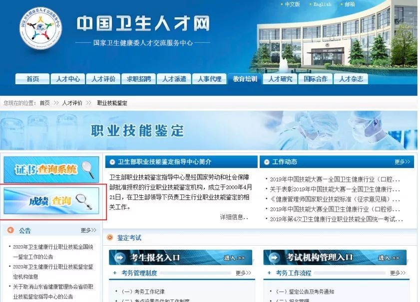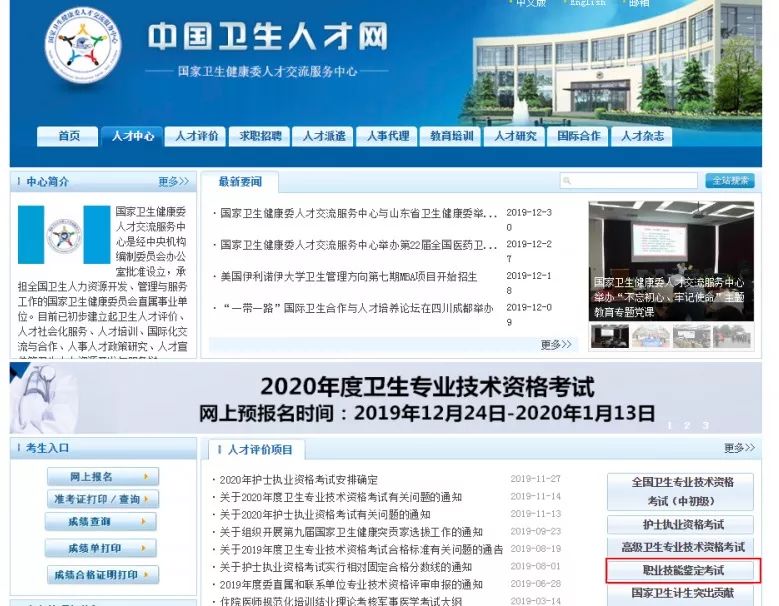 第一步:瀏覽器打開中國衛生人才網,進入網站后,找到第一屏的右下位置,就是圖中紅框框的位置,點擊【職業技能鑒定考試】。