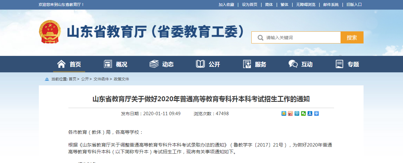 今日,山東省教育廳發布關于做好2020年普通高等教育專升本科考試招生工作的通知,通知內容如下: