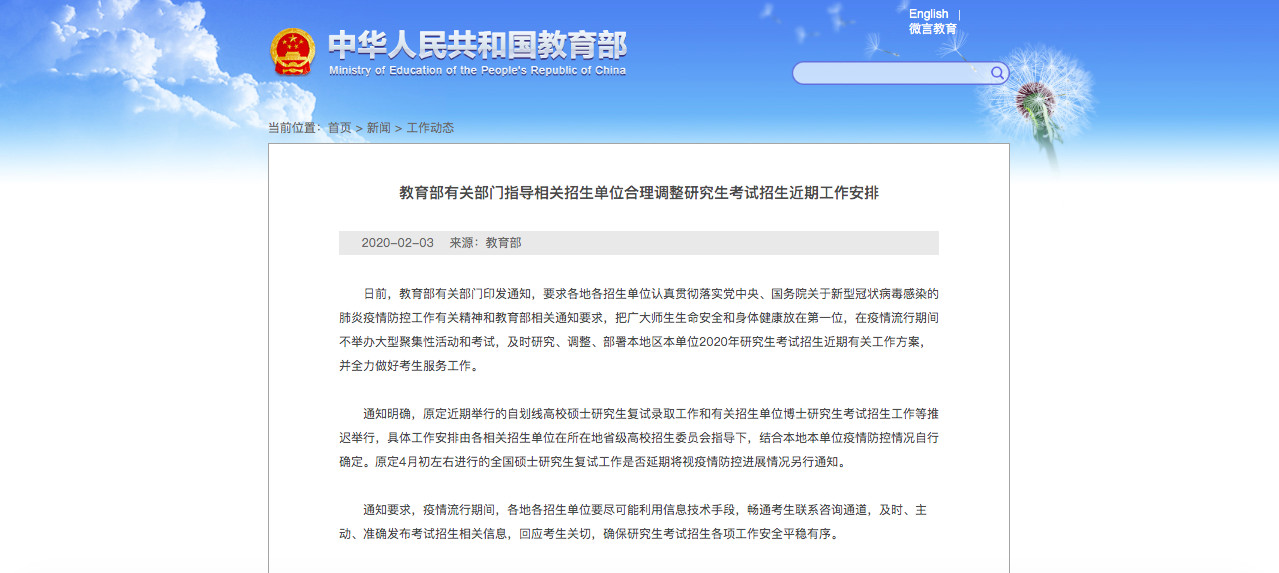 教育部有關部門印發通知,原定自劃線高校碩士研究生復試錄取工作和有關招生單位博士研究生考試招生工作等推遲舉行,具體工作安排由各相關招生單位在所在地省級高校招生委員會指導下,結合本地本單位疫情防控情況自行確定。