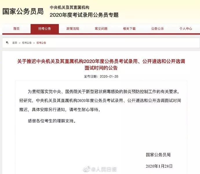 國家公務員局發布公告稱,中央機關及其直屬機構2020年度公務員考試錄用、公開遴選和公開選調面試時間推遲,具體安排另行通知,請考生耐心等待。