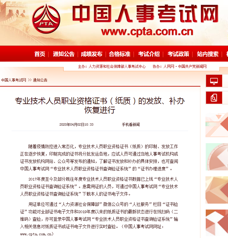 專業(yè)技術(shù)人員職業(yè)資格證書(紙質(zhì))的印制、發(fā)放工作正在逐步恢復(fù)中!