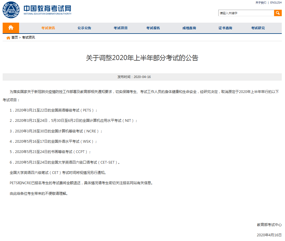 PETS和NCRE已報名考生的考試費將全額退還,具體情況請考生密切關注報名網站有關信息。