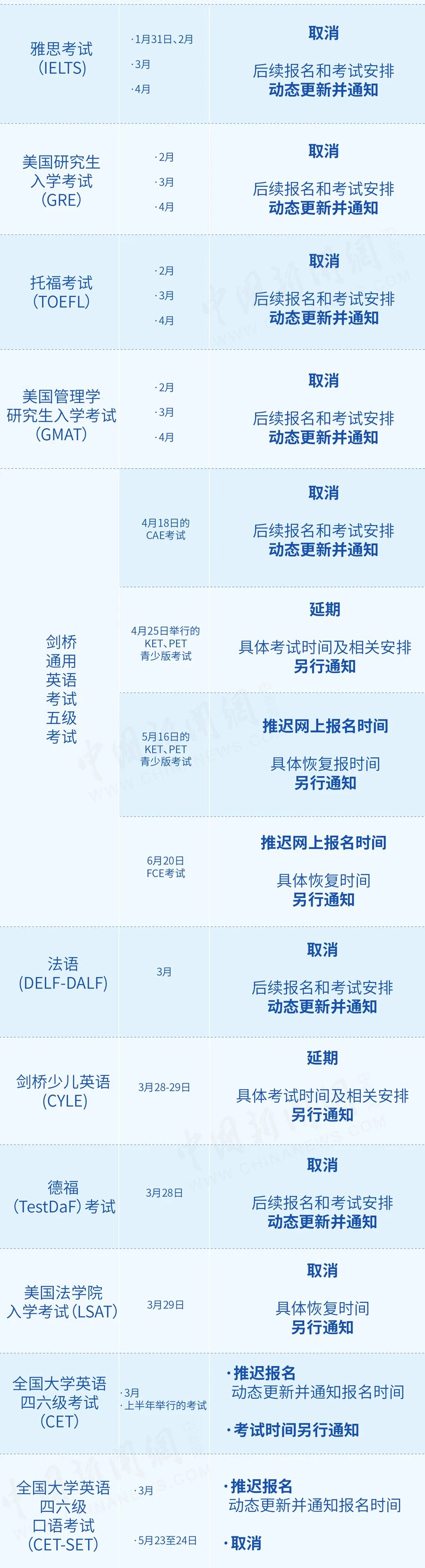 教育部考試中心4月20日發(fā)布《關于調整2020年5月海外考試的通知》。通知明確,取消2020年5月所有托福、雅思、GRE、GMAT等考試,考試費將全額退還至考生個人報名賬戶:
