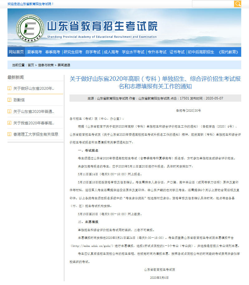 日前,山東省教育招生考試院發布了《關于做好山東省2020年高職(專科)單獨招生、綜合評價招生考試報名和志愿填報有關工作的通知》。一起來了解下考試報名和志愿填報的有關事項吧。