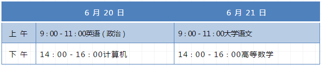 (三)考試。專升本考試時間為2020年6月20日—21日。各科考試時間安排如下: