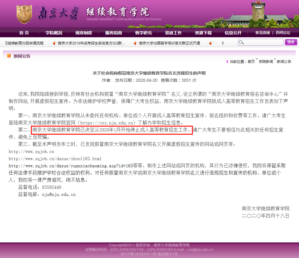 上個月,南京大學繼續教育學院官網發布通告,南京大學繼續教育學院已決定從2020年1月開始停止成人高等教育招生工作。消息一出,引起廣泛關注。