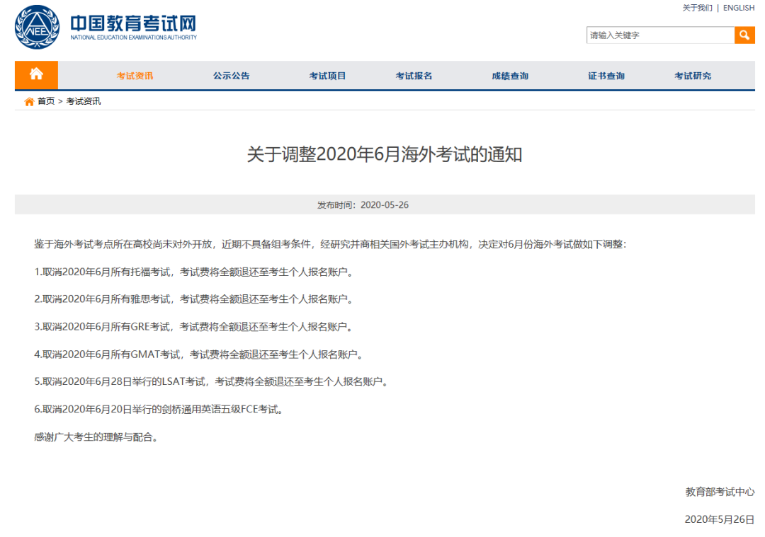 3.取消2020年6月所有GRE考試,考試費將全額退還至考生個人報名賬戶。