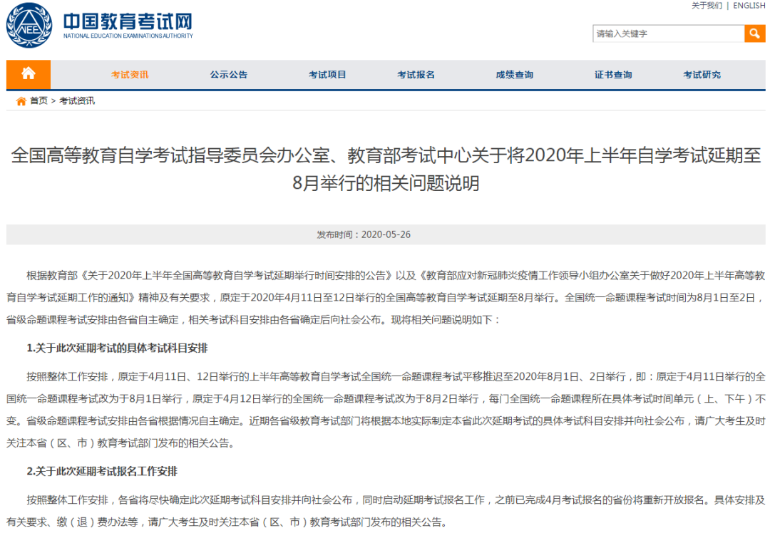 全國高等教育自學考試指導委員會辦公室、教育部考試中心關于將2020年上半年自學考試延期至8月舉行的相關問題說明: