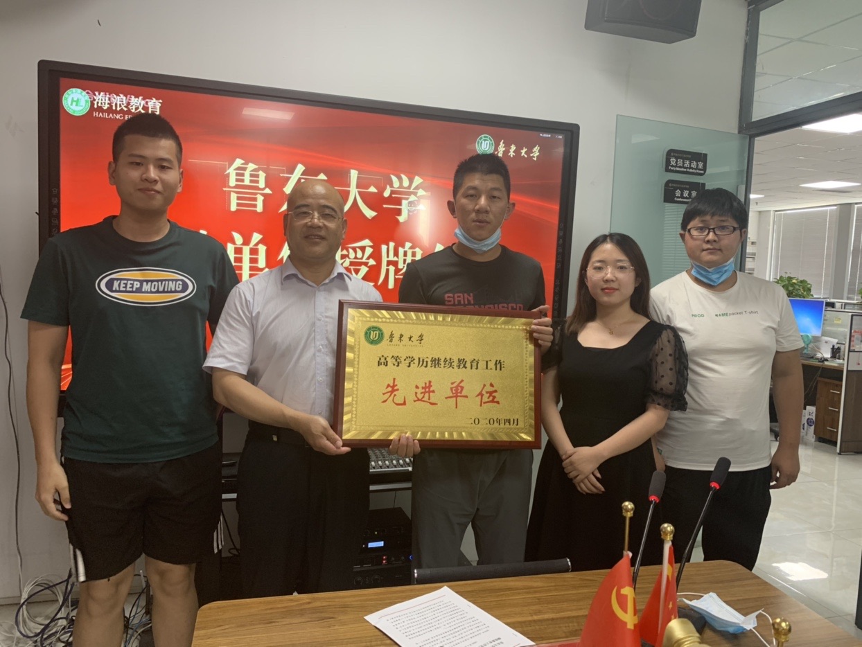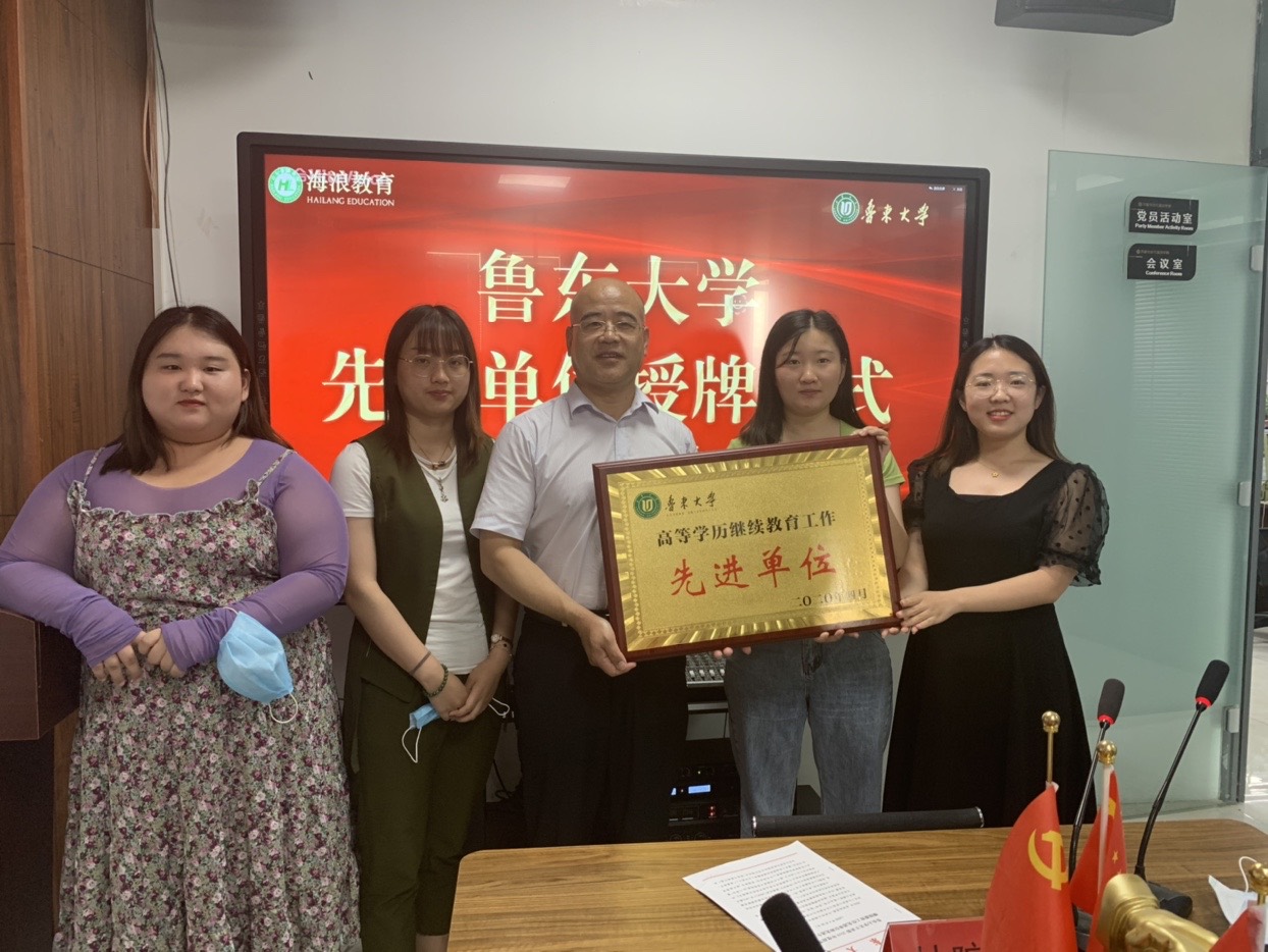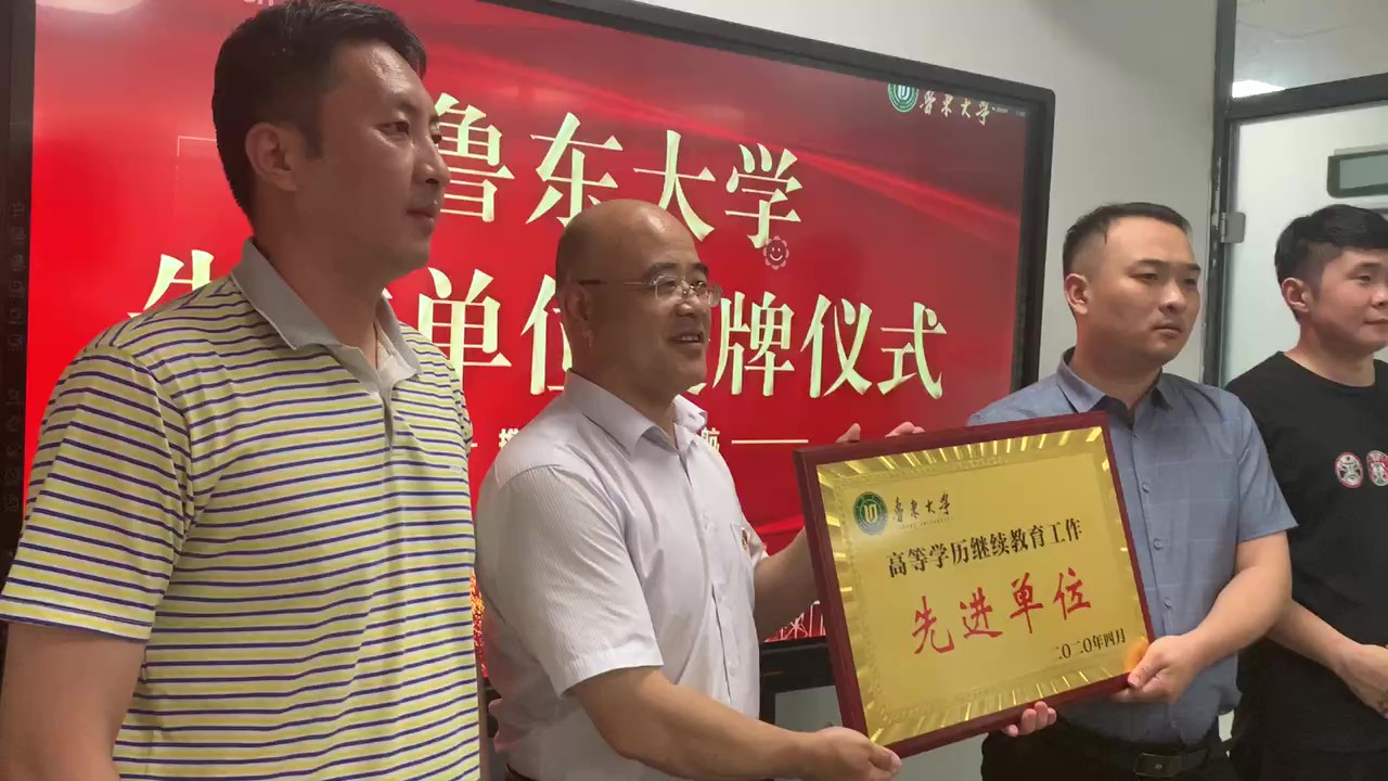 儀式中,魯東大學(xué)繼續(xù)教育學(xué)院林院長(zhǎng)向我校授予魯東大學(xué)“高等學(xué)歷繼續(xù)教育工作先進(jìn)單位”榮譽(yù)牌匾。
