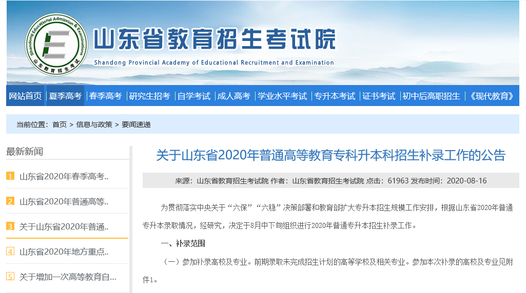 山東省教育招生考試院昨天發出公告《關于山東省2020年普通高等教育專科升本科招生補錄工作的公告》,根據山東省2020年普通專升本錄取情況,經研究,決定于8月中下旬組織進行2020年普通專升本招生補錄工作。