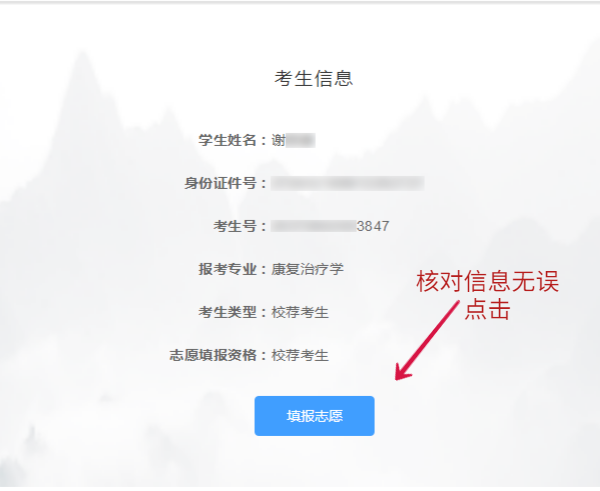 進入系統,核對考生信息,點擊“填報志愿”進入下一步。
