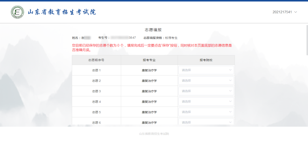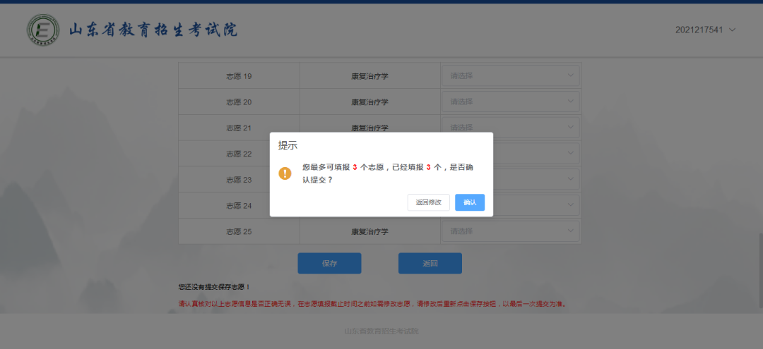 填報完成點擊“保存”按鈕,核對信息,確認填報。注意,在志愿填報截止時間之前可以修改志愿,修改后重新保存,以最后一次提交為準。
