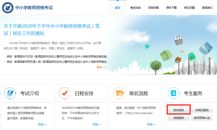 登錄中小學教師資格考試網,在右下角的“考生服務”,選擇“報名系統”