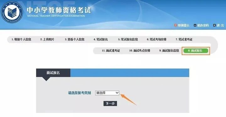 在報名系統界面,點擊第8項“面試報名”,然后根據提示依次選擇考試類別、考區以及科目,再點擊“報名”,到這里網上報名就結束了。不過可別心急,報名還沒結束哦。
