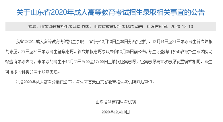 今日,山東省教育招生考試院發布關于山東省2020年成人高等教育考試招生錄取相關事宜的公告。