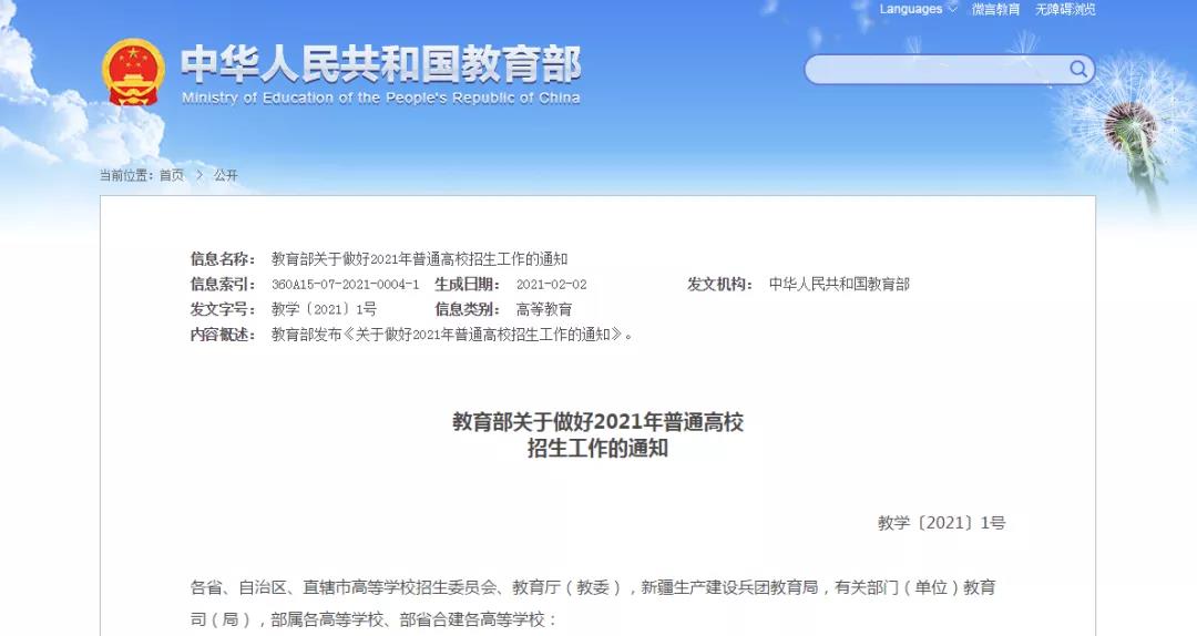 教育部官網今日發布《教育部關于做好2021年普通高校招生工作的通知》